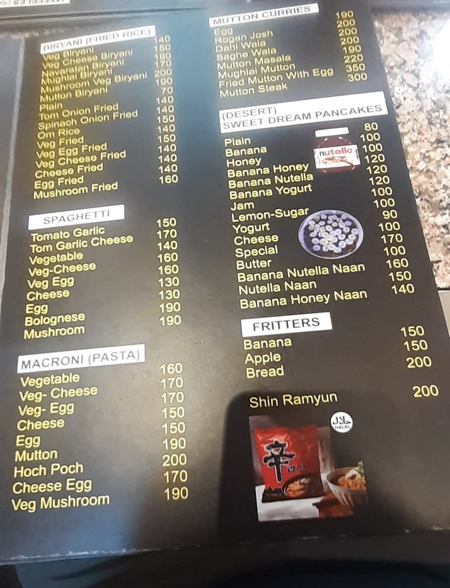 - Breakfast and Sweet Treats: Breakfast items include dishes like nutella pancakes with banana and banana nutella naan, combining elements from different cuisines.
