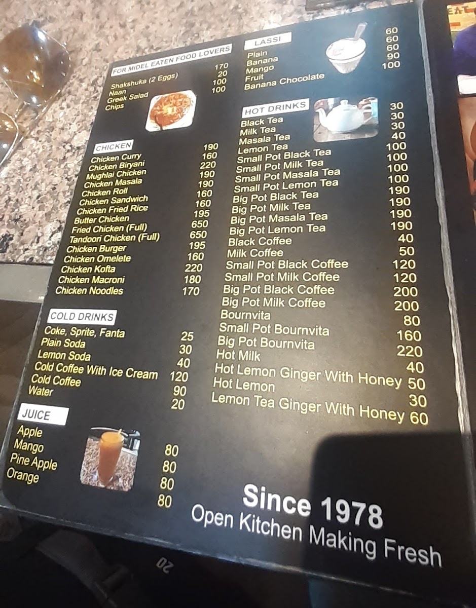 - Beverages: A variety of drinks are offered, including fresh juices like mango juice, traditional chai, and several lassi options such as banana lassi and banana chocolate lassi. Cold coffee with ice cream is also available for coffee breaks or light refreshments.