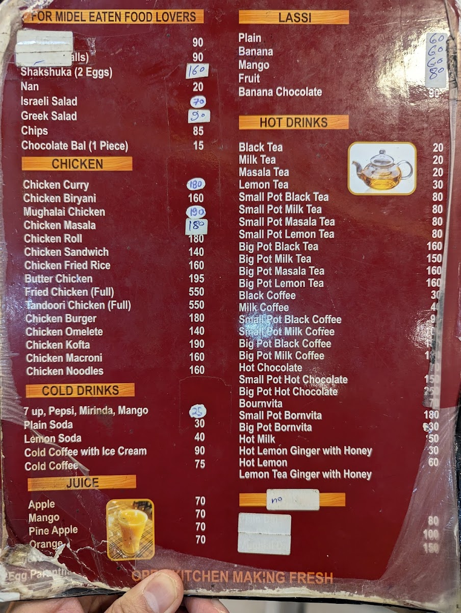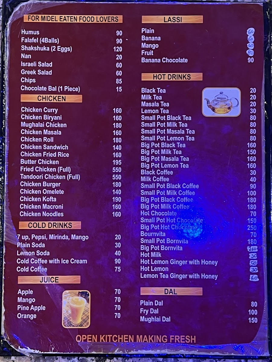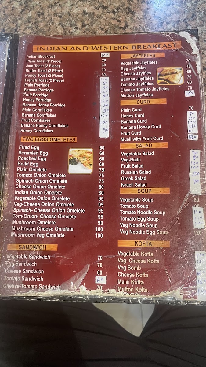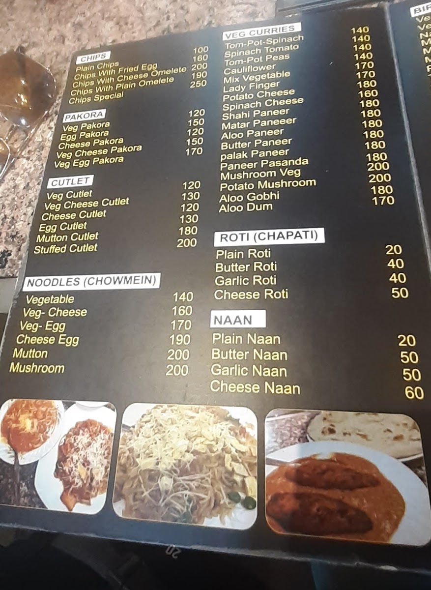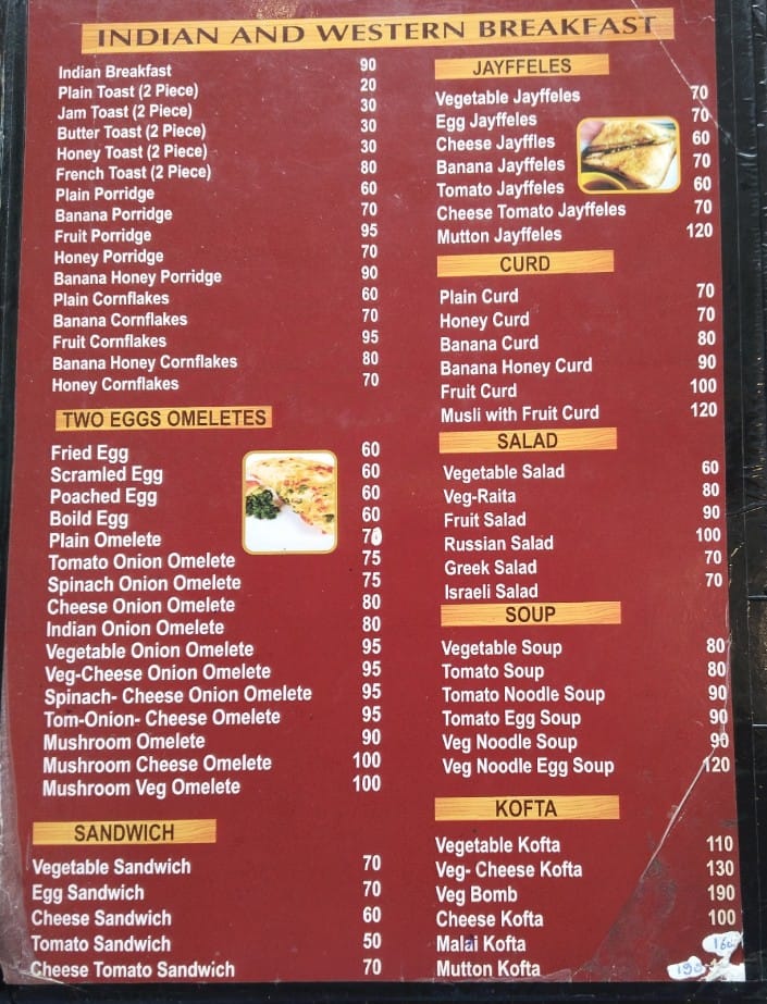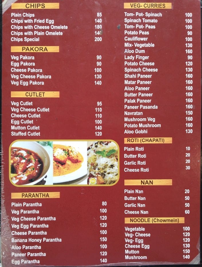 - Snacks and Light Bites: This section includes various types of chips served plain or with different omelet combinations, as well as a range of pakoras featuring vegetable, egg, and cheese variants. Cutlets prepared with ingredients like vegetables, cheese, egg, and mutton are also available.